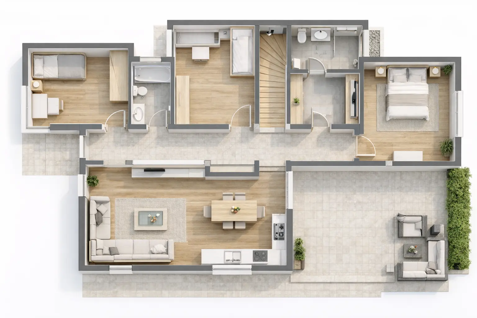 Livingul generos cu bucătărie open space devine punctul central al casei: aerisit, înalt și scăldat în lumină naturală. Zona de noapte include trei dormitoare — dintre care unul matrimonial cu baie proprie, pentru un plus de intimitate.
